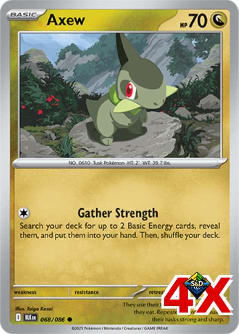 Expand your Pokémon TCG collection with this 4x Axew playset from the Black Bolt series. Each card is graded Near Mint, ensuring excellent condition for competitive play or display. Perfect for deck builders looking to complete their Axew lineup or collectors seeking premium-condition multiples. Ideal for enthusiasts who demand quality and consistency in their trading card acquisitions.